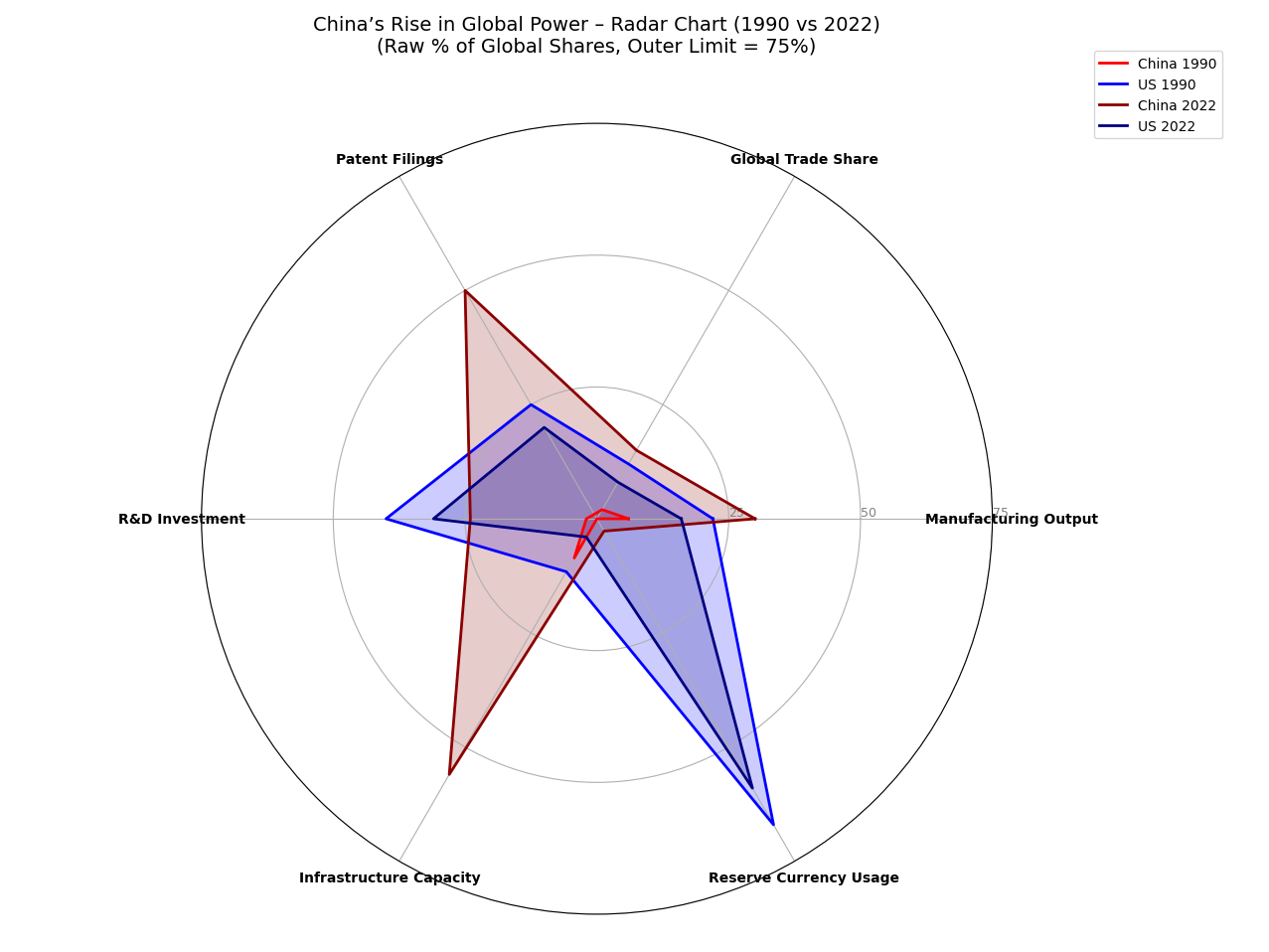 In this radar chart comparing key supply‑side metrics for China and the United States in 1990 and 2022, each metric is presented as the raw percentage share of a global total on a 0–75 scale. We deliberately focus on these production‐oriented indicators because they provide a clear, measurable insight into the state-led industrial and technological transformation that has propelled China’s resurgence.