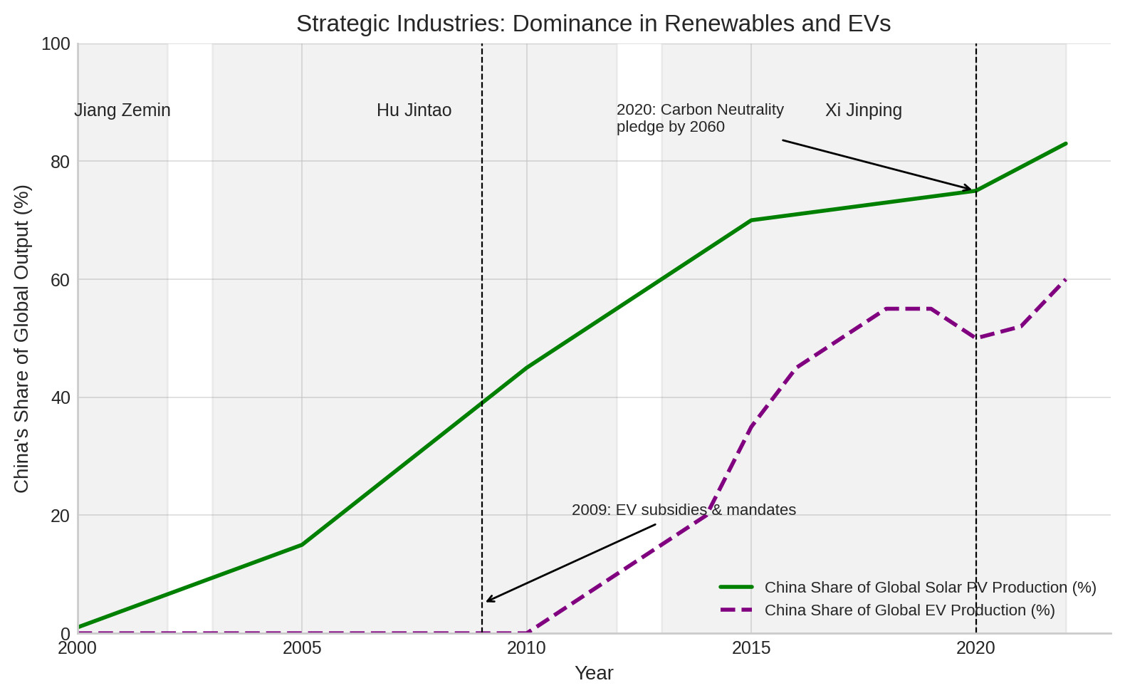 In summary, the comparative radar charts underscore the narrative of the past 40 years: China transformed from an isolated, agrarian economy to an industrial and technological superpower. Across successive leadership eras – from Mao to Deng to Jiang to Hu to Xi – China systematically expanded its share of global manufacturing from ~5% to ~30%, its share of trade from <1% to ~15%, and became the top producer in critical technologies and infrastructure inputs. This rapid catch-up (and in some areas overtaking) of the United States is historically unprecedented. The only dimension where China remains a junior partner is international finance (the U.S. dollar’s dominance). Going forward, whether China can translate its economic might into equal financial and institutional influence – and how the U.S. and China manage this power transition – will be central questions for the coming decades.