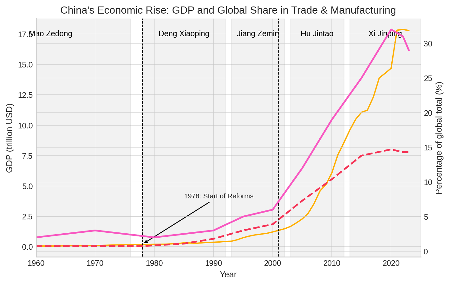 China’s GDP soared from virtually negligible levels under Mao to $17.8 trillion in 2022, second only to the U.S. Deng Xiaoping’s Reform and Opening (1978) ignited explosive growth – by 2001 (WTO entry) China was the “workshop of the world.” As the chart shows, China’s share of global manufacturing output surged from under 5% in 1990 to roughly 30% by 2020, eclipsing all rivals. Likewise, its share of world merchandise exports climbed from ~2% in 1990 to 14–15% today. These gains reflect deliberate policy shifts: Deng prioritized economic development over ideology, spurring double-digit growth in the 1980s–90s. WTO accession in 2001 then supercharged China’s export machine (note the sharp post-2001 rise). By Hu Jintao’s era, China surpassed Germany, Japan, and finally the U.S. to become the #1 manufacturing nation and trading power. Today under Xi Jinping, China produces one-third of global manufactures and 15% of world exports, up from almost nil decades ago – a dramatic elevation of economic clout.