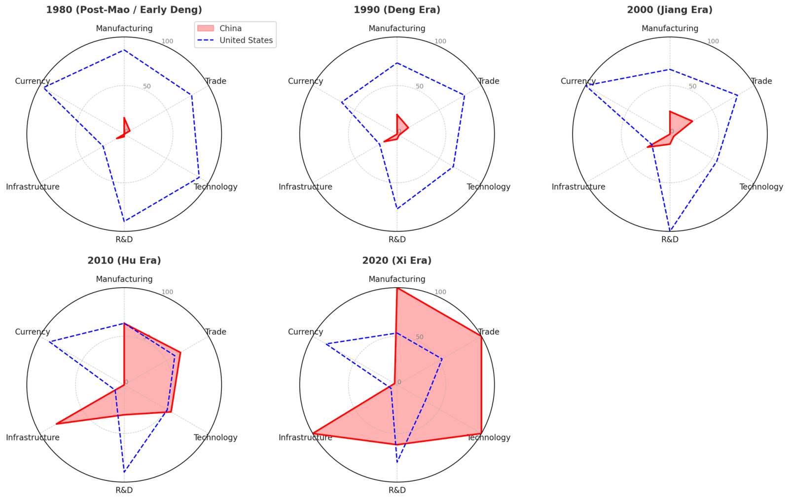 China’s rise over these leadership eras is clearly reflected in the comparative radar charts. Under Mao (1950s–70s), China was a minor contributor to global economic metrics. Following Deng’s reforms (1980s–90s), China began a steady ascent in manufacturing and trade. By Jiang and Hu’s tenure (2000s–2010s), China had become a top-tier industrial and trading nation, with huge gains in technology and infrastructure. And under Xi (2010s–20s), China has in many respects become a global powerhouse rivaling or surpassing the United States in economic scale and technological output.